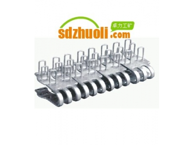 一、產品用途:強度等級不大于1000N/mm織物帶芯輸送帶的聯接。二、產品特點:1、連體式帶扣:接頭受力分布均勻,使用壽命長;接頭直線度好,便于接頭對接;2、“V”形扣釘布置:減少輸送帶裝訂截面的損傷,使接頭強度高;3、獨特的板式扣體:扣體低平、扇形導入面減少